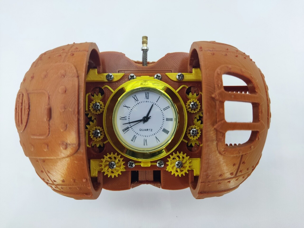 В свое время уже печатал на эту тему стакан для ручек (копилку) с часиками, а на этот раз решил доделать давно лежащий проект в 3D. Благо наконец удалось купить крепеж М2 (который довольно редок оказался). Сами часики - стандартные с алика. В качестве раскрывающих усилий для открытия дверок использовал офисные резинки закрепленные между шестеренкам. Еще пару пружин под кнопку и фиксаторы положения. Печатал все тем же шелковистым PLA медным и золотым.