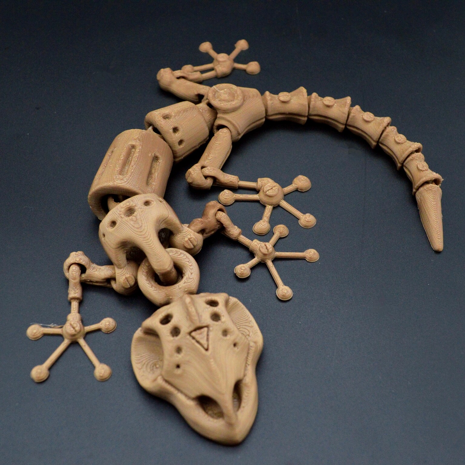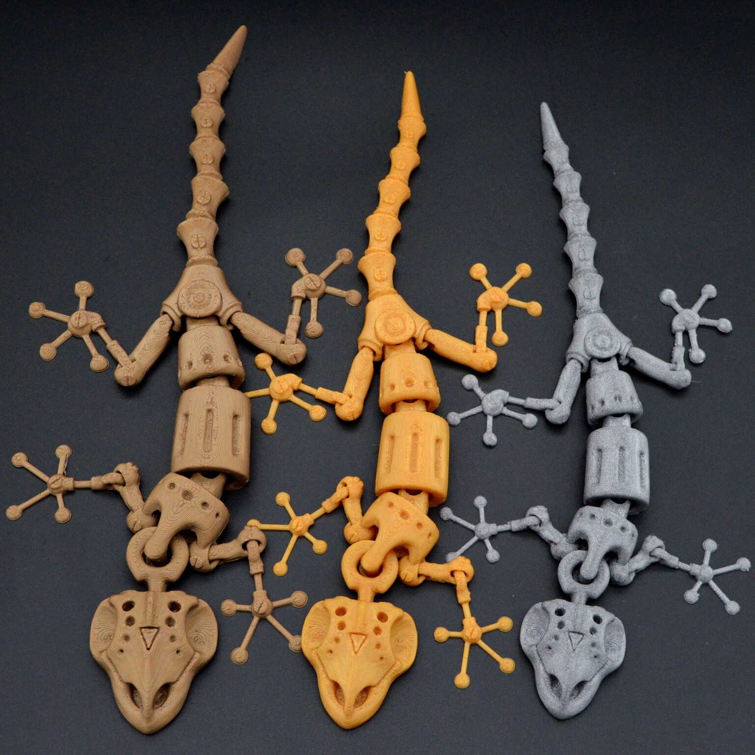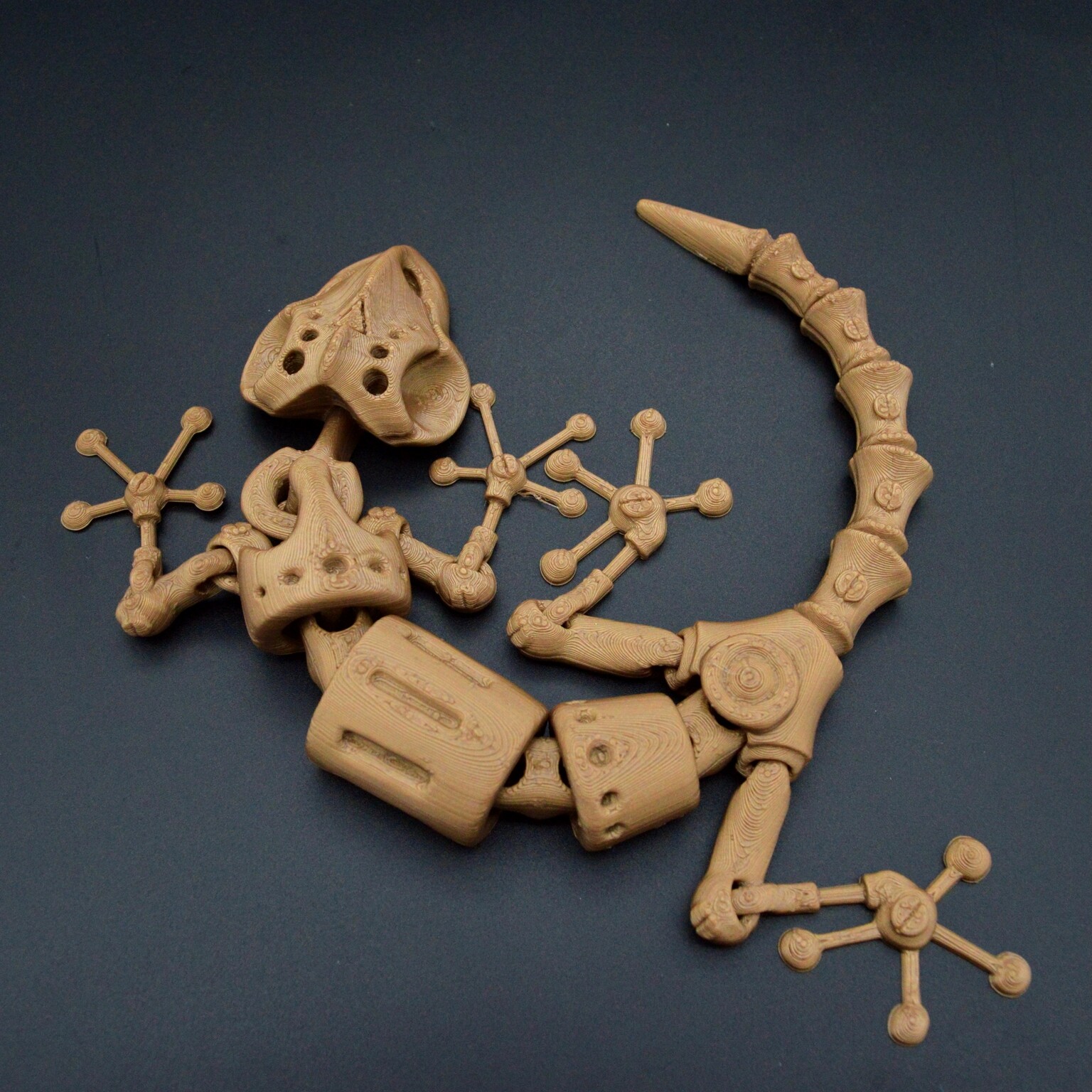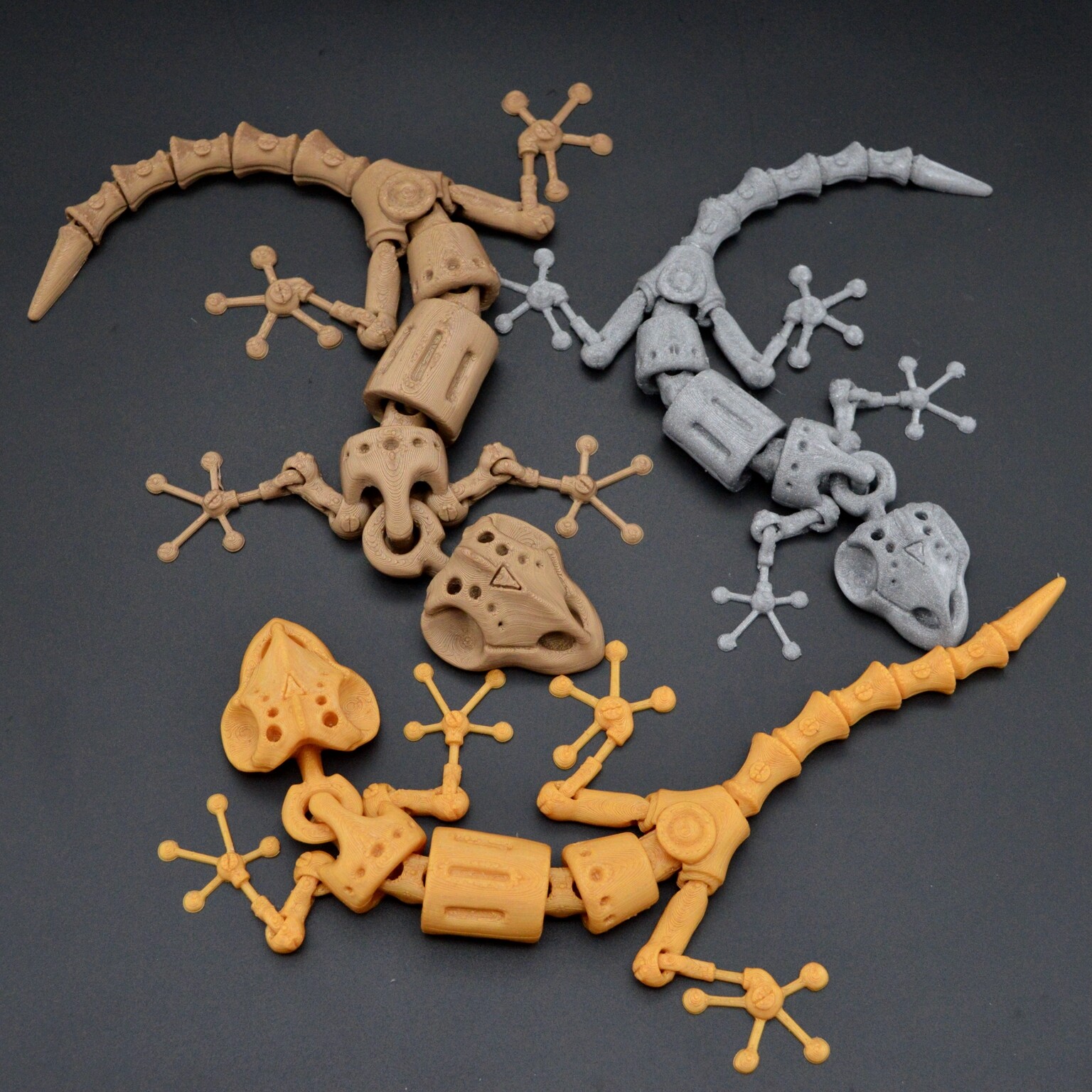 Продолжаю тематику подвижных игрушек, теперь решил сделать ящерицу в стиле стимпанка (по моему видению). Моделька печатается легко без всяких поддержек, но должна быть хорошая адгезия (много мелких элементов). На фото ящерицы с разным масштабом: 120, 110, 100 %.