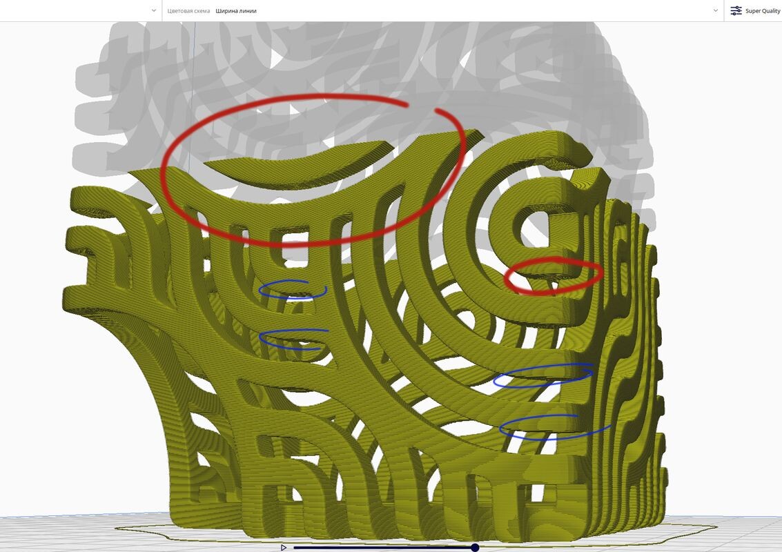 Ну что могу сказать. Постигла неудача при 3д печати, а точнее - нужны Поддержки! Формы изгибов иногда начинали печататься в воздухе, если поддержек не было ( отмечено красным) и возникали наплывы пластика при пологом угле ( отмечены синим, наплывы начинались от примерно от 70*)