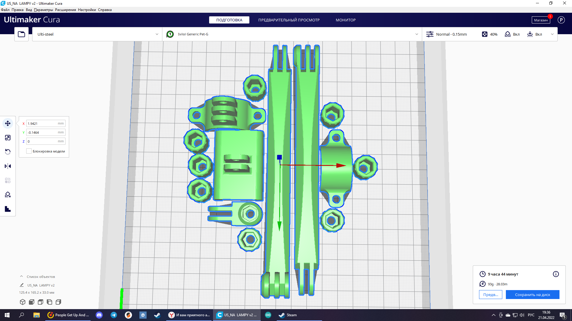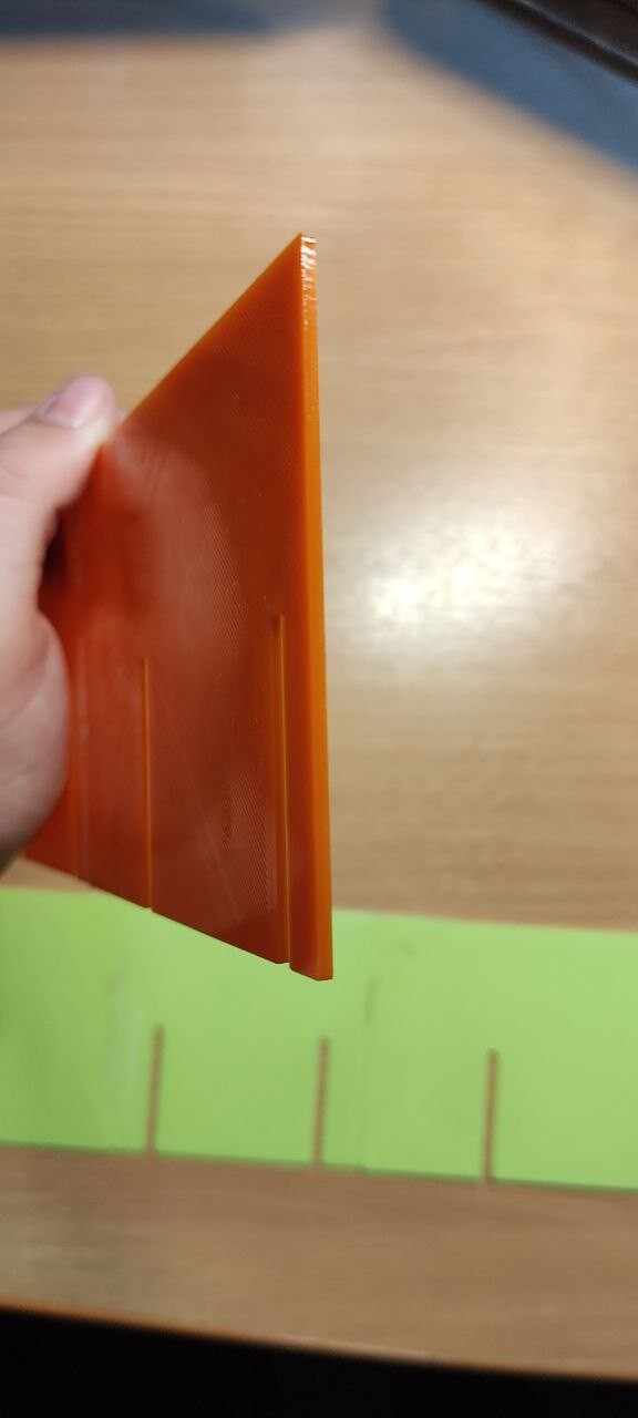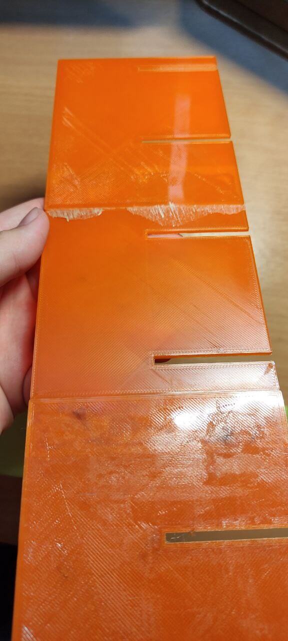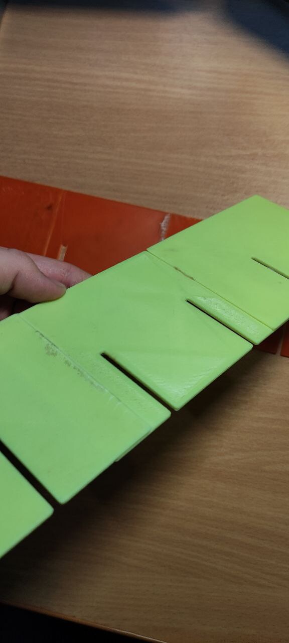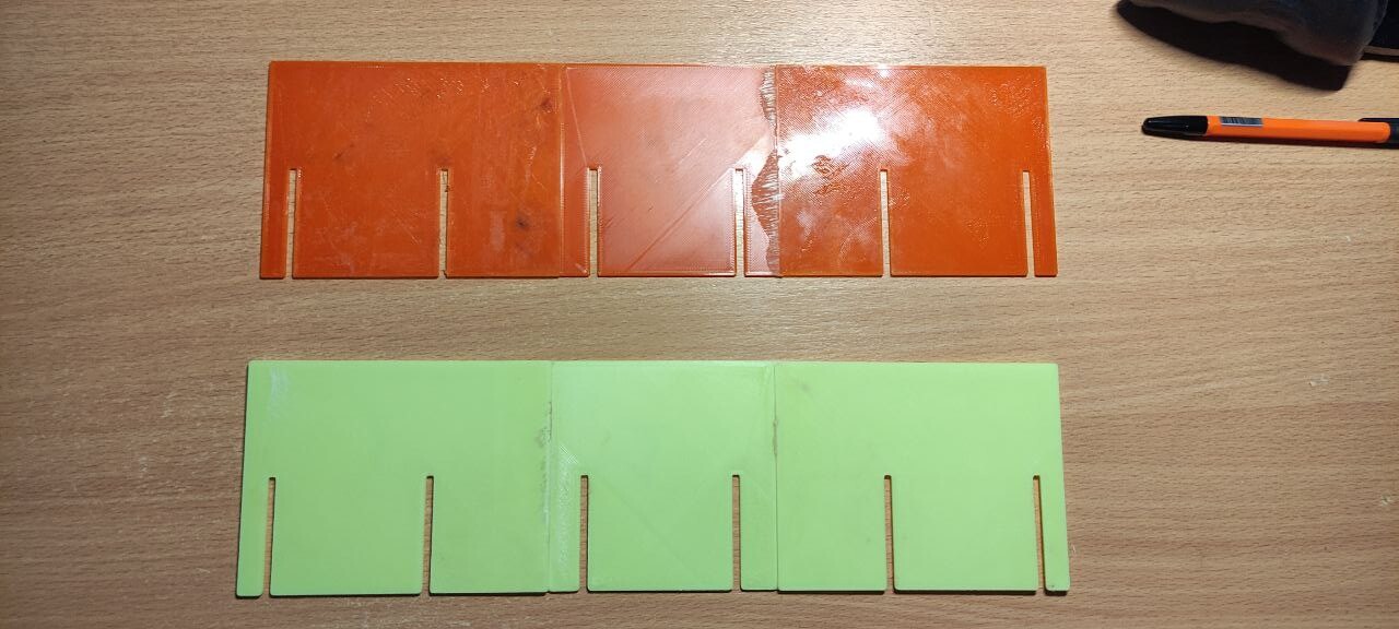Petg от FDplast, 40% заполнения, 2 части сборочного конструкции для посадки семян. Немножко неприятная была для меня эта работа, потому что длина всего изделия - больше 30 см, а значит надо было бы как-то все делить и потом склеивать. Другие способы соединения не подходят, потому что максимальная ширина - 2 мм. Полчаса моделинга и 3 части были готовы. Но Паша был бы не Паша, если бы не без косяков. Крч Паша дурачок, и в сопло, которое печатало до этого все петгом зарядил стеклонаполненный АБС. Незнаю, что мне стрельнуло в тыкву, и при этом я поменял сопло ( поставил стальное) и забыл откалибровать. В итоге получилось не то, что я ожидал. Тип я хотел держать в руках мощную деталь , а в и тоге было нечто среднее. Может я криворукий (но это не точно), но я потом поставил петг, и со второго раза получилось прям четко, даже слоновой ноги не было ( хотя я до этого полностью голову перебрал и очистил, может это повлияло). Все эти детали я склеил, и сейчас мать ими активно пользуется (Оранжевый - пластик Petg, салатовый - стеклонаполненный АBS)