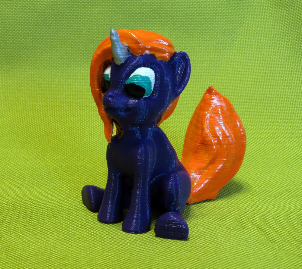 Каждый уважающий себя трудоголик должен иметь на рабочем месте тотем пони как напоминание. Мой выбор пал на Tempest Shadow.Модель взята со всем известного сайта. Время печати было 6 часов на большую модель, и 4 на маленькую. Печатал разрезав на две половины по плоскости симметрии. Из обработки только склейка половин. Далее только покраска гривы и брони. Для печати использовался фиолетовый PLA пластик от Bestfilament. Цвет пластика идеально совпал с цветом персонажа My Little Pony: The Movie Сначала модель большего размера с цветом брони как в кино.Теперь в серебристой броне и черных штанишках.Ну чтобы два раза не писать ещё одна модель пони-белки. Без постобработки. Печаталась без поддержек.