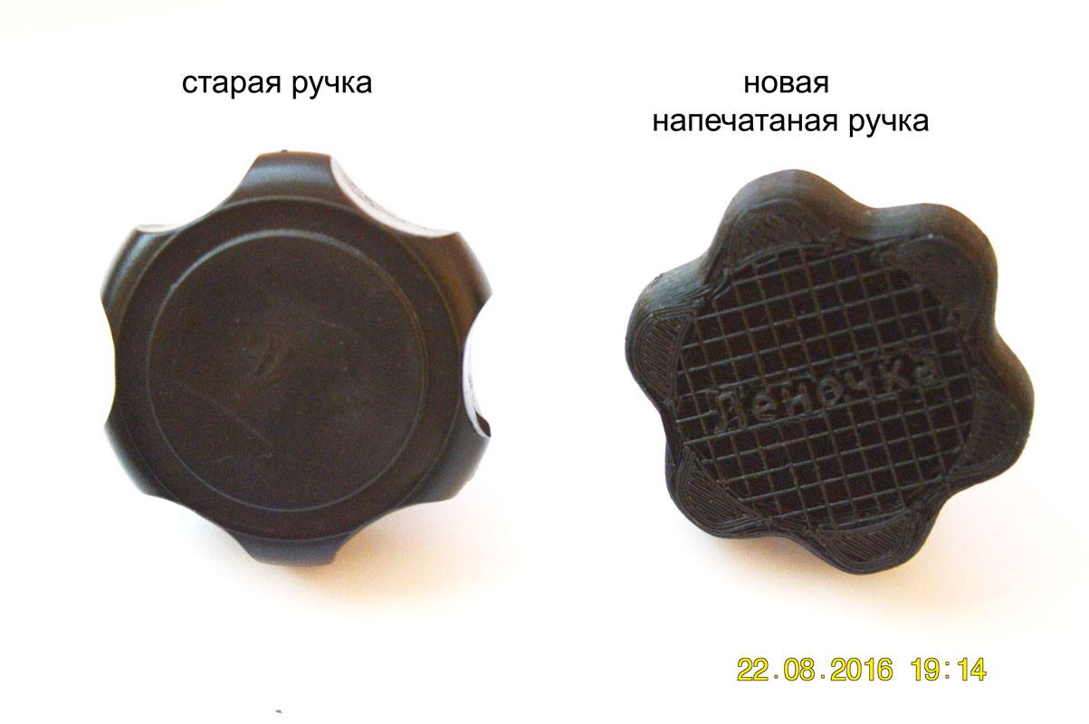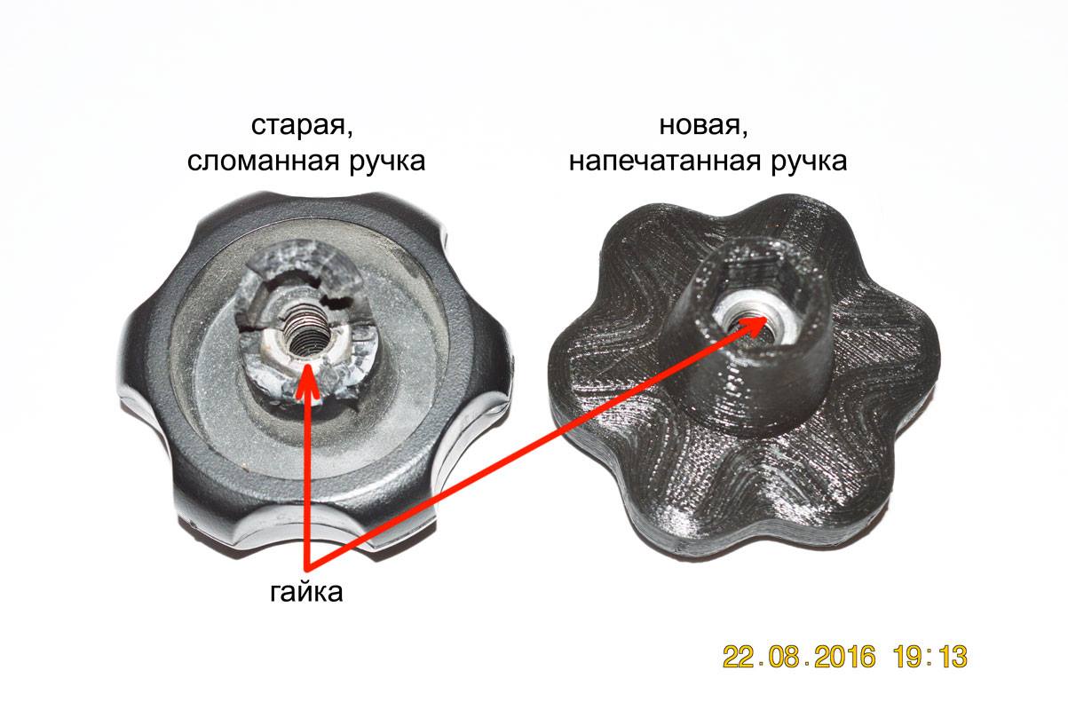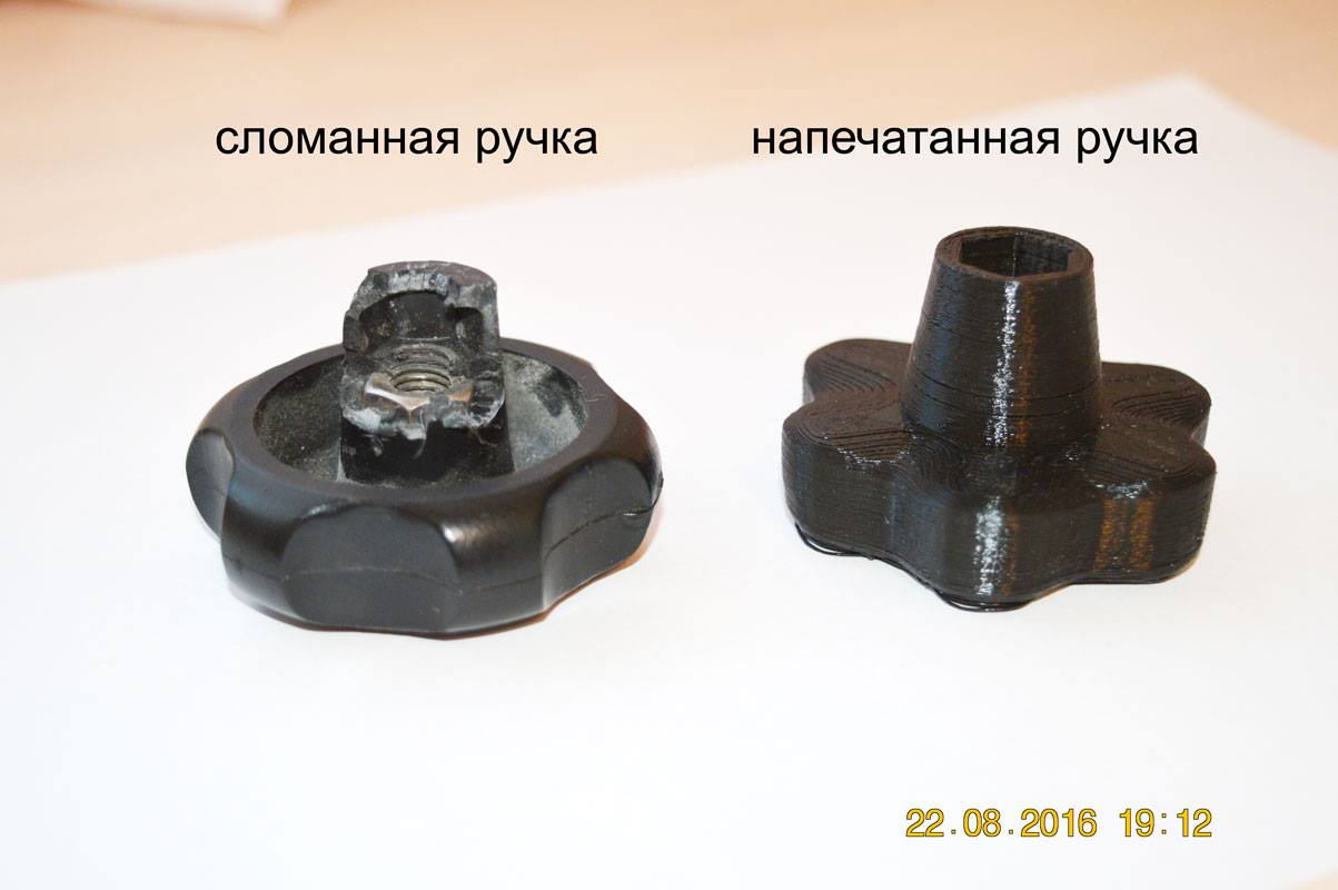 После печати тестовой модельки решил напечатать что-нибудь полезное. Долго искать не пришлось :) - на глаза попалась сломанная ручка от стойки для синтезатора. На фото ниже - она и (справа) созданный клон:Модельку ручки выложу чуть позже, вдруг кому-нибудь понадобится.
