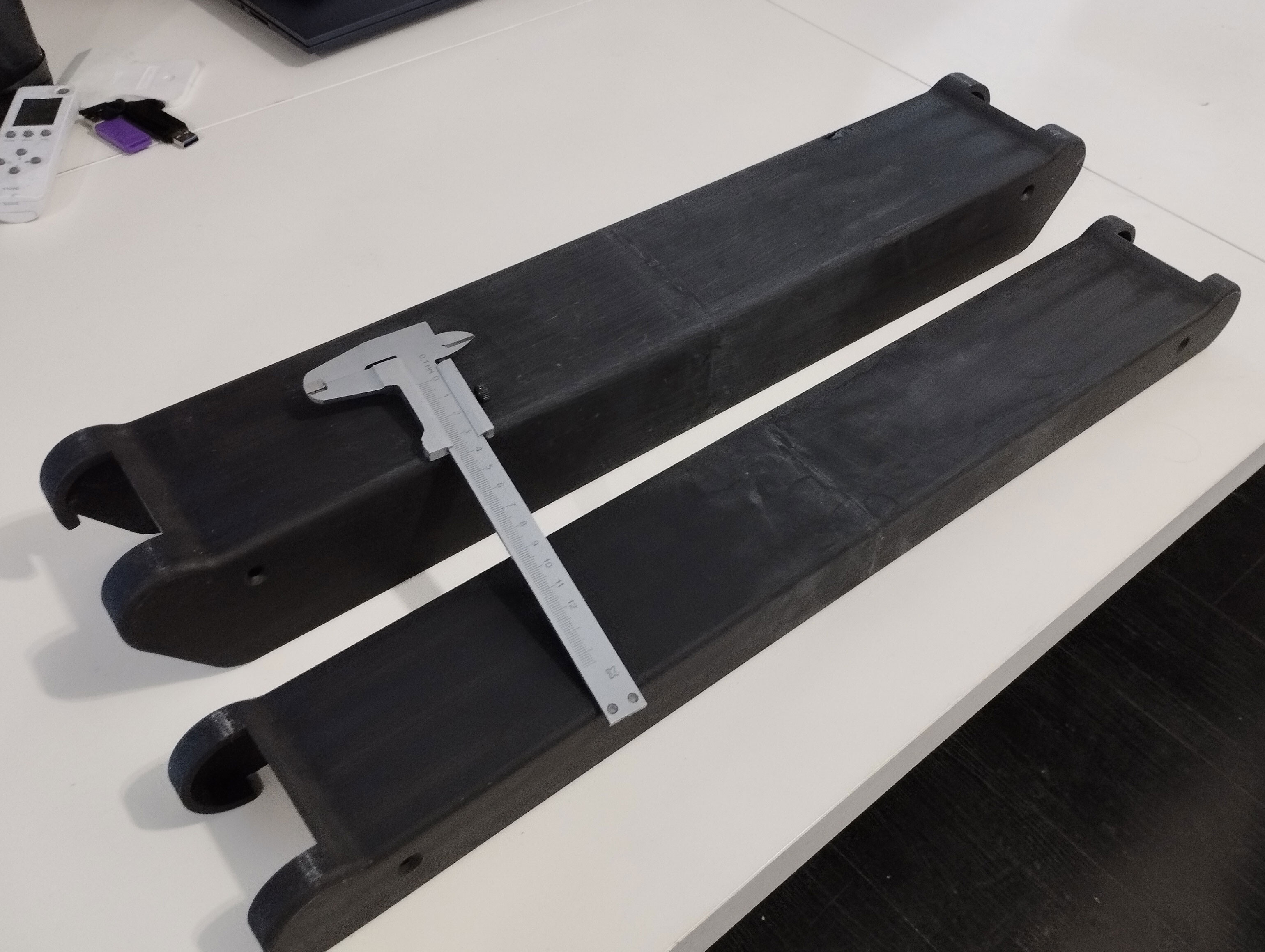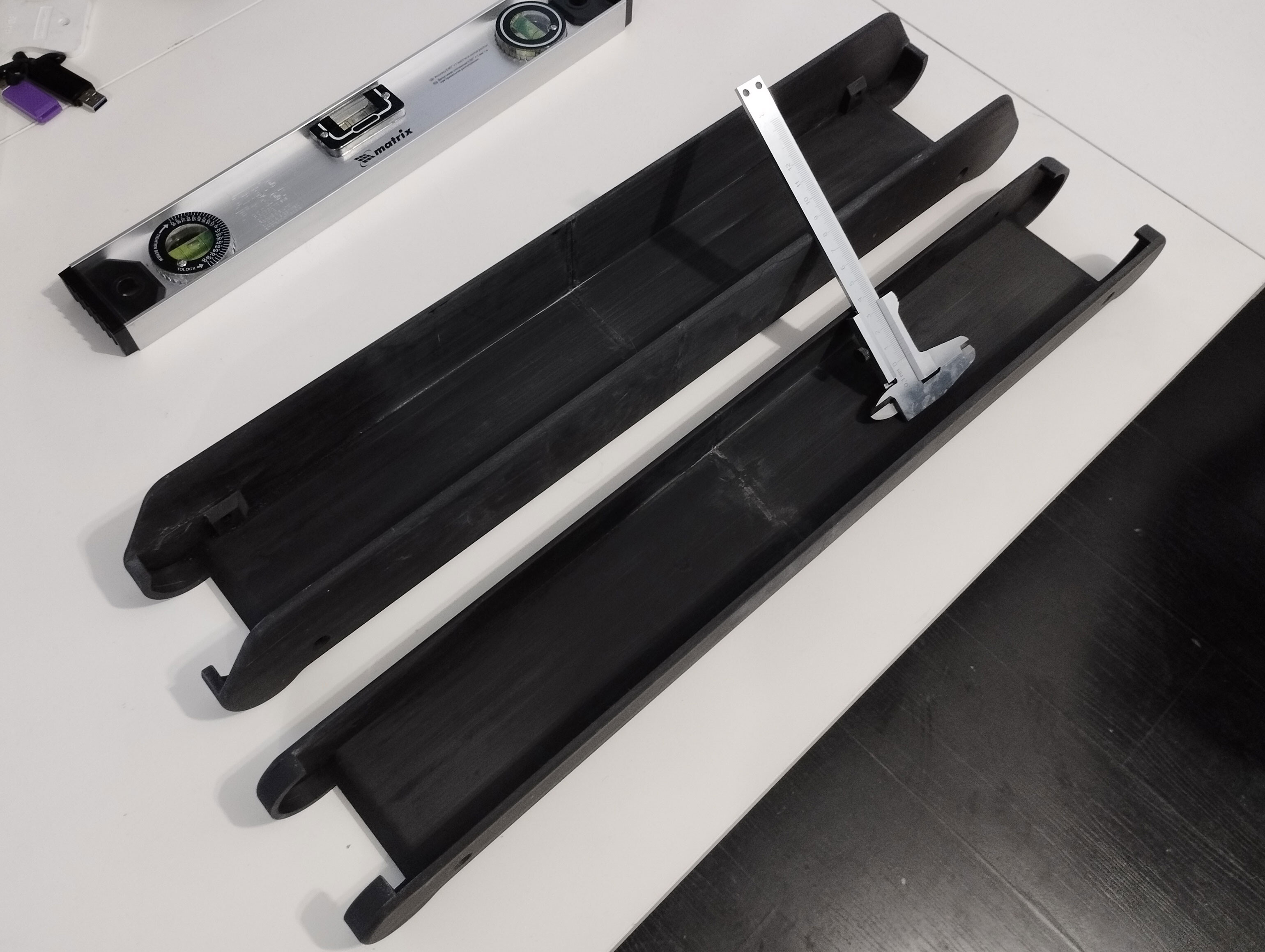 Описание: заказ на печать двух больших деталей (кожухов) для робота. Печатались от стола, почти без поддержек. Итоговая погрешность по высоте, после склейки — около -50мкм (видимо, сказалась усадка или неточность шага высоты калибровки по 100мкм). Отклонение по вертикали — около 0, не смог точно замерить. Плоскости тоже удалось вровнять почти в 0, но не стал сильно заморачиваться, тк это не требовалось и их потом будут красить. Размер большой детали 566х96х73